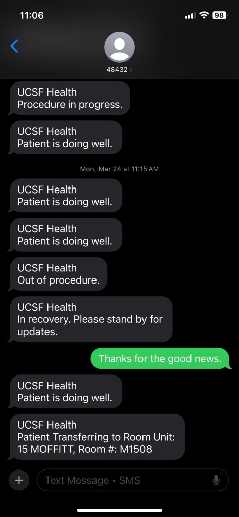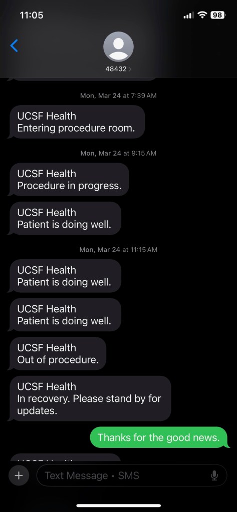 3/24/2025 was the big day. She was rolled down to the pre-op area before 6am. The neurosurgeon chatted with us while showing full confidence in the success of the surgery and that was comforting. While Thomas was waiting upstairs, he would receive regular text messages from the nurse regarding the surgery and Rebecca’s well-being which was very comforting.